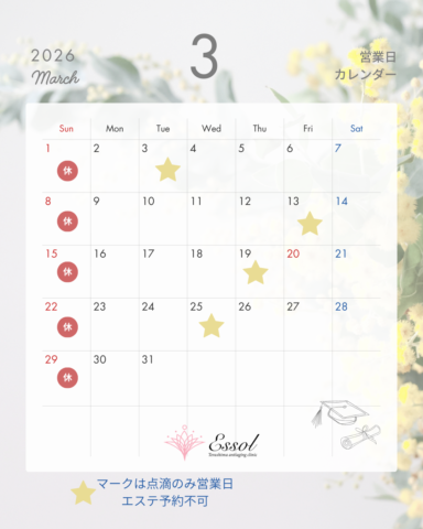 こんにちは☺寺島クリニック・エソールです🌸3月も日曜日以外営業予定です★!※カレンダー★マークがついている日はエステ休業日で点滴のみのご案内日となります。そして、2月27日からはFIRST-ARTMAKE京都京田辺店がエソール内でオープンし...